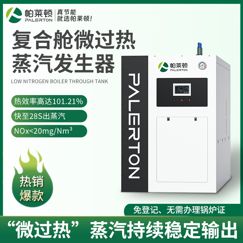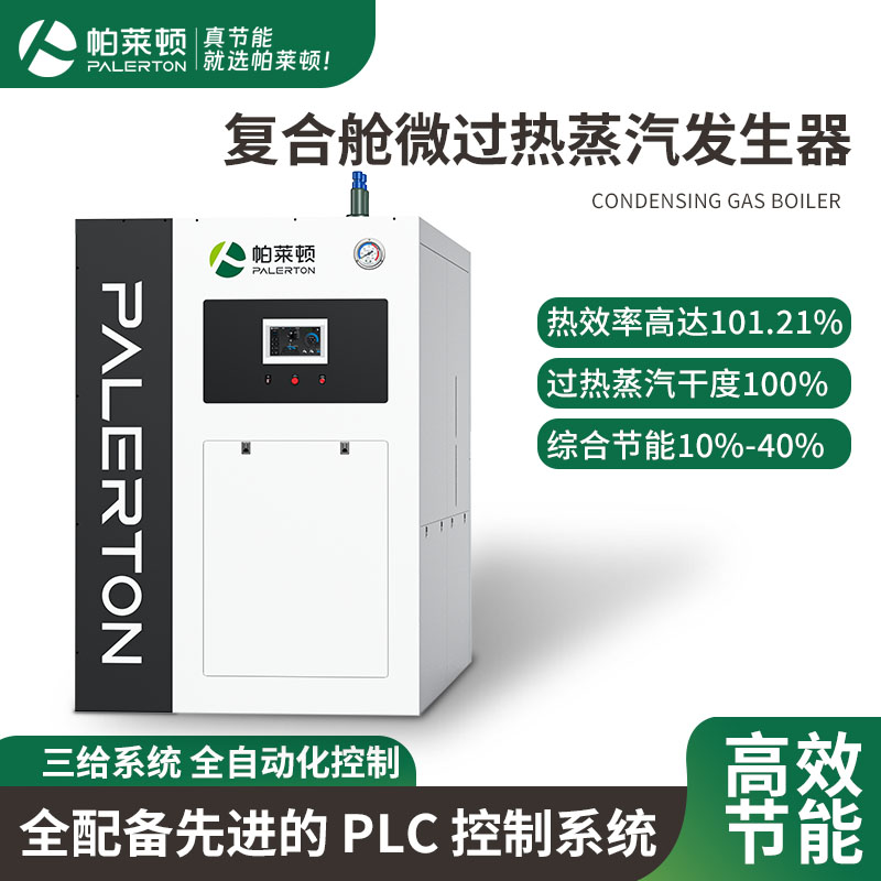 第三代复合舱微过热蒸汽发生器,吨蒸汽耗气量≤75Nm³/h,氮氧化物NOx≤20mg/Nm³,过热蒸汽干度可达100%,最高蒸汽稳定可达230℃,锅炉热效率101.21%,排烟温度稳定低于50℃,CO排放趋近于0mg/Nm³,水冷燃烧器,火焰温度控制在1100℃以下,自动排污,24小时运行自检,整机质保1年 炉体质保3年。