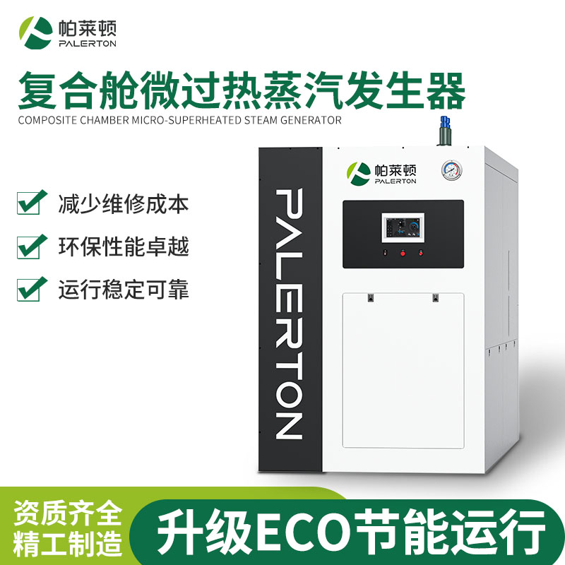 第三代复合舱微过热蒸汽发生器,吨蒸汽耗气量≤75Nm³/h,氮氧化物NOx≤20mg/Nm³,过热蒸汽干度可达100%,最高蒸汽稳定可达230℃,锅炉热效率101.21%,排烟温度稳定低于50℃,CO排放趋近于0mg/Nm³,水冷燃烧器,火焰温度控制在1100℃以下,自动排污,24小时运行自检,整机质保1年 炉体质保3年。
